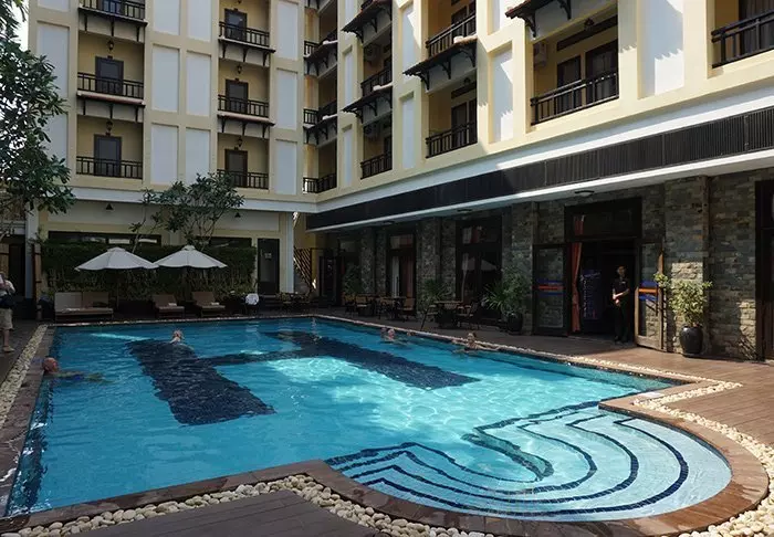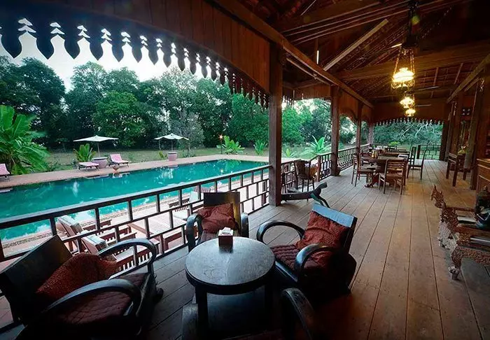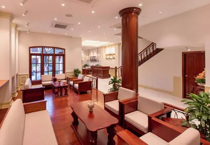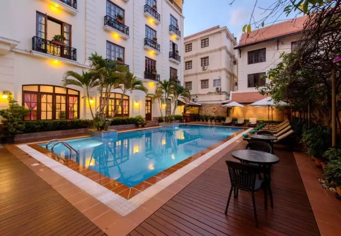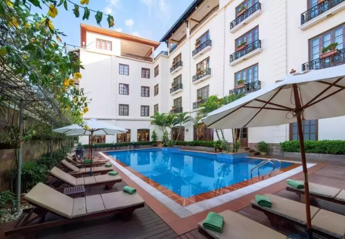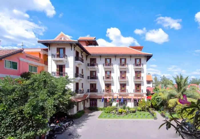 Man får virkelig følelsen av å befinne seg i en oase når man setter foten inn på dette hotellet. Du blir ønsket velkommen av en kolonistil blandet med tradisjonelle khmer-dekorasjoner.