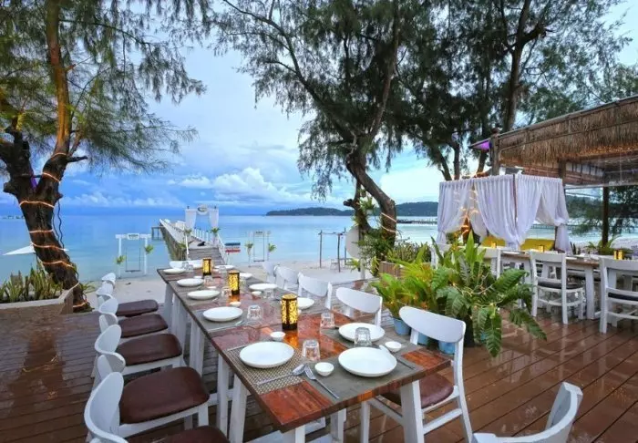 Om dagen kan du slappe av i solsengene på stranden og nyte en forfriskende drink fra strandbaren, Coconut Beach Bar. Om kvelden kan du se solnedgangen fra Sun Deck Beach Bar. Restauranten, som også ligger på stranden, er åpen både morgen, middag og kveld og serverer et bredt utvalg av khmer-retter, asiatiske og internasjonale retter. Utenfor restaurantens åpningstider kan du alltid få deg litt snacks i baren.