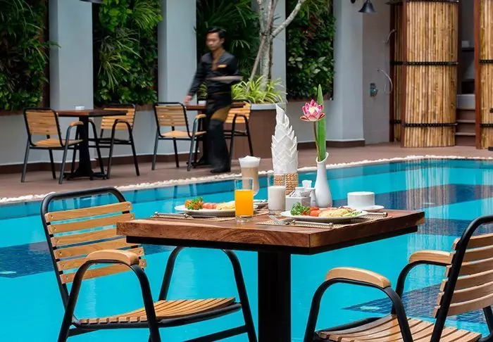 Ved siden av svømmebassenget finner du hotellets restaurant og bar. Restauranten tilbyr både buffet og à la carte-servering med retter fra både det internasjonale og kambodsjansje kjøkkenet. Baren serverer øl, vin, bobler og fargerike cocktails.