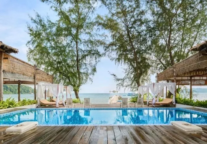 I strandkanten på den rolige sørvestsiden av Koh Rong ligger nydelige Sok San Beach Resort. Her lever man livet med sand mellom tærne på en av øyas fineste strender, Long Beach, også kalt Sok San Beach. Resortet har 98 rom og bungalower.