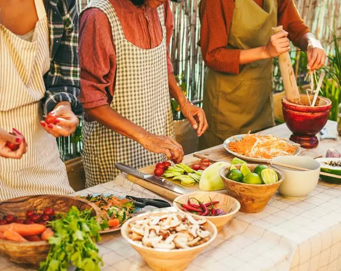 I dag lærer du å lage tradisjonelle laotiske retter, som skal gis til de lokale munkene. Du blir hentet fra hotellet og kjørt til Phosy-markedet, hvor du og guiden skal møte en lokal familie. Sammen kjøper dere dagligvarer til dagens matlaging, inkludert fisk, grønnsaker og frukt. Etter å ha handlet, bur du med hjem til familien, der du lærer å lage de tradisjonelle rettene. Blant annet kommer du til å hjelpe til med å lage sticky rice (khao niew), bambusskuddsuppe (Keang Nor Mai), dampet fisk i bananblader (Mok Pa), Luang Prabang-stuing (Ork Lamb) og auberginesaus (Jeo Mak Kheua). Når rettene er ferdige, går dere til tempelet i nærheten. Her vil din guide og familien lede deg gjennom hele seremonien, der du gir almisser og blir velsignet av munkene. Etter seremonien sier du farvel til munkene og drar tilbake til den lokale familiens hus for lunsj. Dette er også en åpenbar mulighet til å lære mer om laotisk kultur og om hvordan familiens hverdag vanligvis ser ut.
