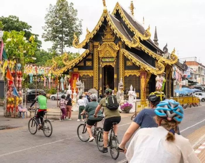 Du vil bli kjørt til kontoret til samarbeidspartneren vår, der du får utdelt en sykkel og sykkelhjelm. Etter en kort briefing er tar du pedalene fatt for å oppleve byens sjarm. Ruten er enkel og flat, så den passer for de fleste. Du sykler gjennom de små og rolige gatene i Chiang Mai til det flotte tempelet Wat Inthakhin Sadue Mueang, som er kjent for sin 700 år gamle hvite Buddha-statue. Sykketuren fortsetter videre forbi Tre konger-monumentet og til byporten Tha Phae, som var der handelsmennene brakte varer inn i byen i gamle dager. Her forteller guiden mer om Chiang Mai som et tidligere handelssentrum. Turen går videre til markedet Somphet, som ligger i nærheten. Her blir det litt tid til å vandre rundt og ta inn atmosfæren, og du får også muligheten til å smake på spennende frukt og fargerike søtsaker. Etter dette venter Wat Chiang Man, som er det eldste tempelet i Chiang Mai. Her oppbevares den 1800 år gamle krystallbuddhaen og den 2500 år gamle marmorbuddhaen. Til slutt besøker du byens største og mest ikoniske monument, Wat Chedi Luang. Her befant opprinnelig den berømte smaragdbuddhaen seg, som i dag er bevart i smaragdbuddhatempelet Wat Phra Kaew i Bangkok.