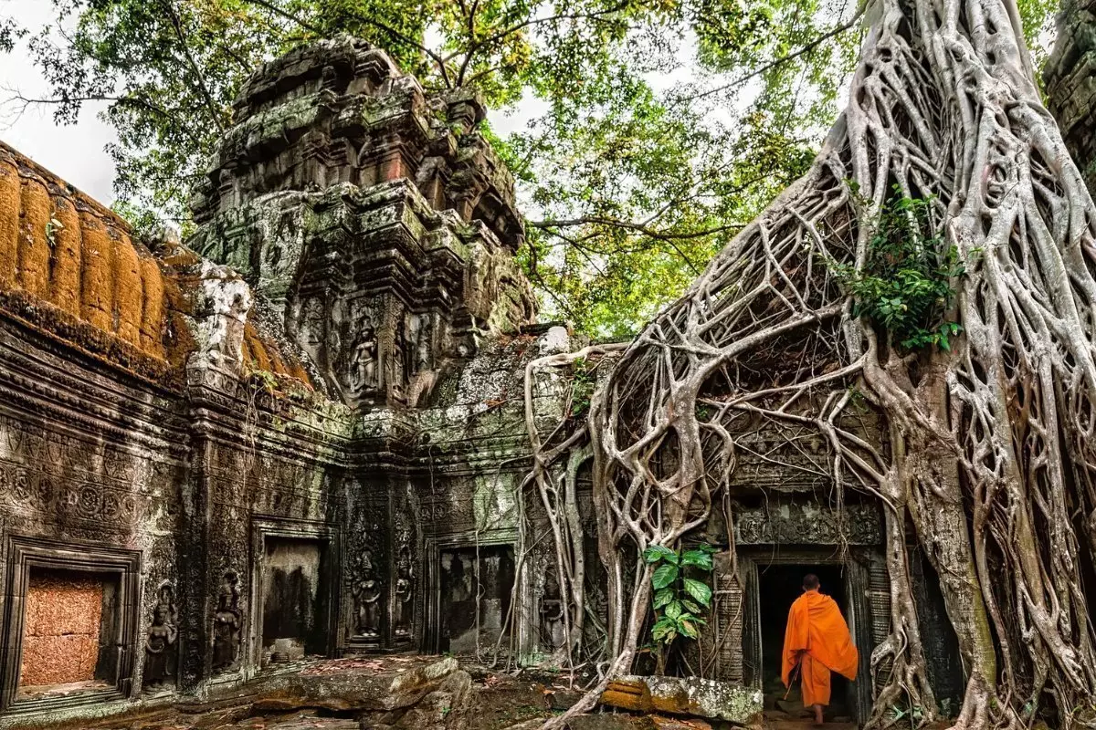 Så besøker du det berømte og enestående Ta Prohm-tempelet, som er helt spesielt. Store, vakre trær har nemlig slått rot midt i tempelbygningene og ser ut som om de går i ett med tempelet.