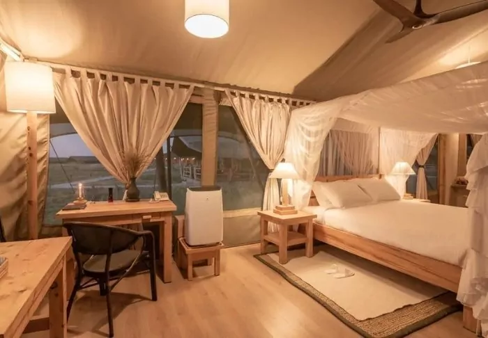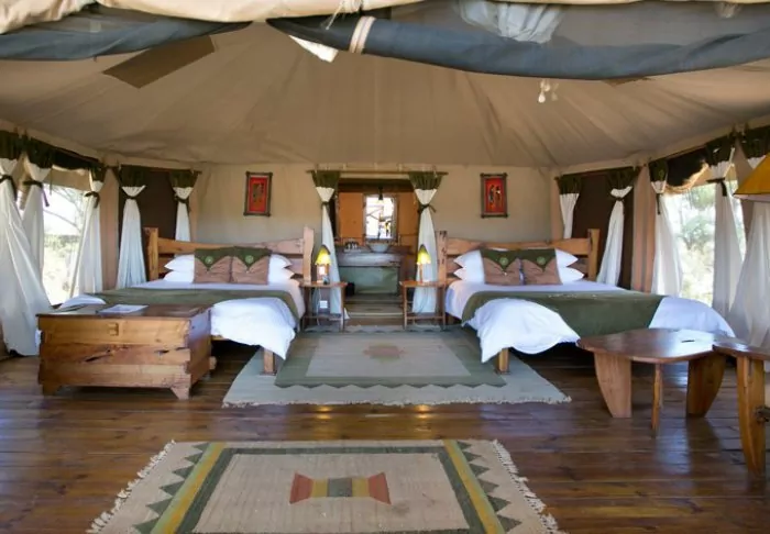 Her overnatter du i et av de 60 store teltene som er spredt utover slettene. Hvert telt har komfortable senger, et lite sitteområde, kjøleskap, te- og kaffefasiliteter, sin egen lille veranda og privat bad med dusj, håndvask og toalett.