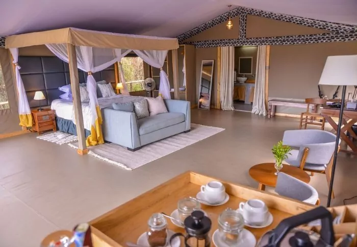 Alle teltene har vifte, drikkevannsbeholder og myggnett rundt sengene. Det er rikelig med plass til bagasjen samt en koselig leseplass. På verandaen er det gode sitteplasser, hvor det er naturlig å nyte solnedgangen over den afrikanske savannen med et glass vin fra baren i hånden.