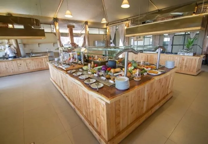 Måltidene nytes i hovedbygningen, hvor du også finner resepsjonen og den koselige baren. På utvalgte kvelder er det til tider også live musikk i baren. Foran restauranten ligger en stor gressplen med benk og hyggekroker, hvorfra det er utsikt til vannhullet, og midt mellom restauranten og teltene finner du bassenget med solsenger rundt.