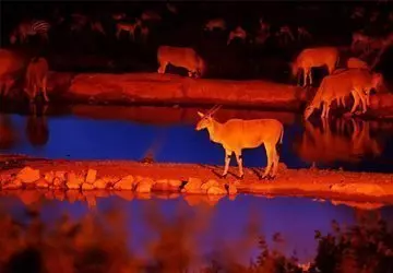 Lodgen er bygget i sten og har en betagende utsikt over vannhullet rett ved. Her er daglig besøk av elefanter, bøfler og mange andre ville dyr.
