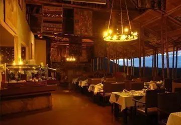 Lodgen har en central stråtekt spiseplass og en bar bygget i natursten. Spidseplassen og baren er forbundet med en terrasse med direkte utsikt ned til vandhullet.