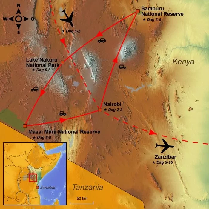 Mye av denne reisen går du i Karen Blixens fotspor. Du vil raskt forstå hvorfor hun ble så fascinert av dette flotte øst-afrikanske landet. Du krysser ekvator og har mulighet til å få nærkontakt med det fantastiske og mangfoldige dyrelivet i viltreservatene Samburu og Masai Mara. Samburu har helt fantastiske landskaper og dyr du ikke finner andre steder, mens Masai Mara lokker med sine karakteristiske akasietrær som gir skygge til savannens dyr. Du opplever de fantastiske landskapene ved den 5 000 km lange Great Rift Valley med fosser, vulkankratere og nasjonalparken, Lake Nakuru, kjent for sine mange neshorn – og de flotte røde flamingoene.