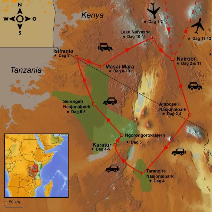 Reisen starter i Amboseli nasjonalpark i Kenya. Du kjenner sikkert denne parken fra bilder: her avbildes elefantene ofte med Kilimanjaro i bakgrunnen. Etter denne flotte introduksjonen i Kenya reiser du over grensen og besøker Tarangire nasjonalpark i Tanzania. Denne parken er spesielt kjent for elefanter og for sine kjempemessige baobabtrær. I Ngorongoro-krateret venter en ”Jurassic Park”-opplevelse, før landskapet igjen skifter dramatisk og du begir deg ut på de mektige slettene ved Serengeti. Her slutter de fleste safarier – men ikke din, for du krysser enda en gang grensen, og tilbake i Kenya venter nå Masai Mara. Siste stopp på reisen er Lake Naivasha før du blir kjørt til flyplassen i Nairobi. Men du trenger ikke reise rett hjem, for det er mulig å forlenge turen med en badeferie i Mombasa, på Zanzibar eller Mauritius.