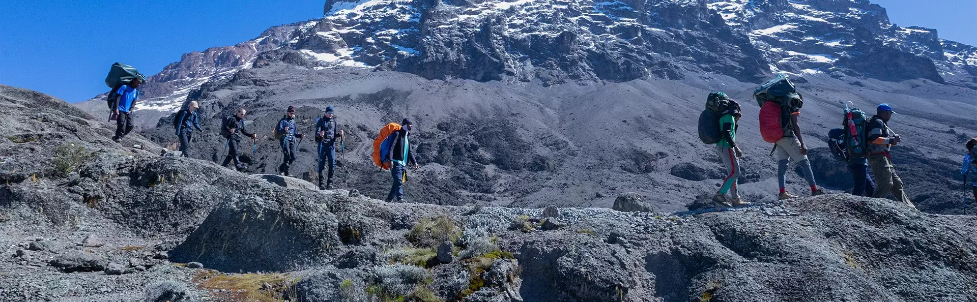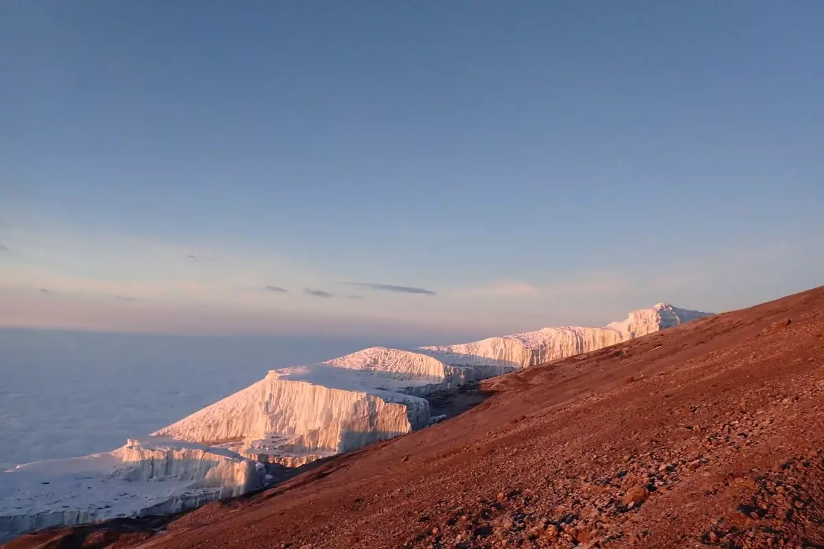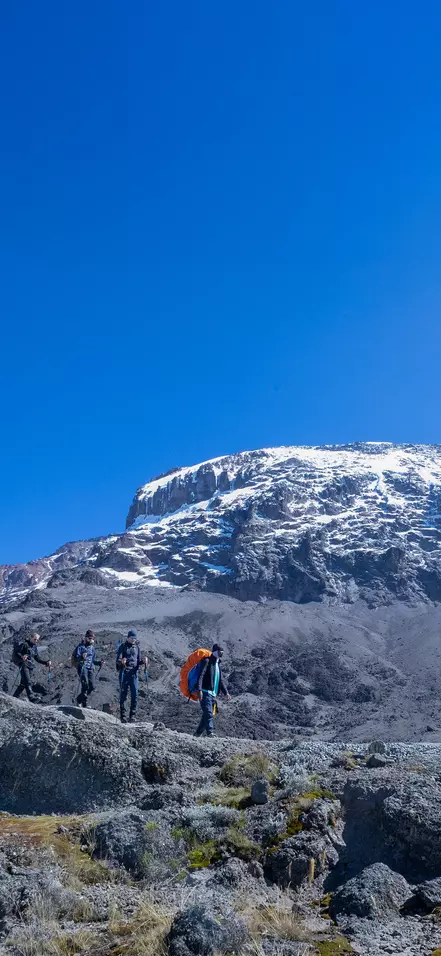 Etter en natt under den imponerende Great Barranco Wall og en solid frokost klatrer du opp den beryktede klippeveggen – noe som heldigvis er lettere enn det ser ut til. På toppen, like under Heim-breen, som henger som kjempestore gardiner av is utover massivet, folder Kilimanjaros skjønnhet seg ut på fantastisk vis.