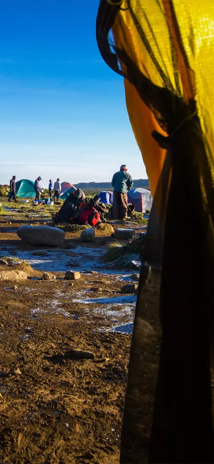 Deretter starter nedstigningen til Barafu Camp, en tur på ca. 3 timer. Her får du en kort og velfortjent hvil før du vandrer videre nedover den steinete stien til Mweka Camp, der det venter en velfortjent god natts søvn. Leiren ligger i den øverste delen av skogen, der det ofte er tåke og regn sent på ettermiddagen. Høydepunktet er nok at du her får både varmt vann og varm mat.