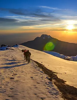 Rundt midnatt står du opp, og etter en snack går turen ut i natten. Det vanskelige terrenget med løse stein du skal gå i de neste timene er for de fleste den største utfordringen på hele turen. Målet er å være fremme ved Gilman’s Point ved daggry, så du kan nå Kibos høyeste punkt Uhuru kort tid etter soloppgang. Du tar en kort pause ved Gilman’s Point, der det er flott utsikt. Du fortsetter langs kraterkanten, og det siste stykke til Uhuru Peak er det jevn stigning. Avhengig av årstiden kan der være snø det siste stykket til Uhuru Peak, som er ditt endelige mål, toppen av Kilimanjaro og toppen av Afrika. Når du står på toppen i 5.895 moh., kan du klappe deg selv på skulderen, nyte den fantastiske utsikten og ta en selfie ved Uhuru Peak skiltet, som et minne for livet.