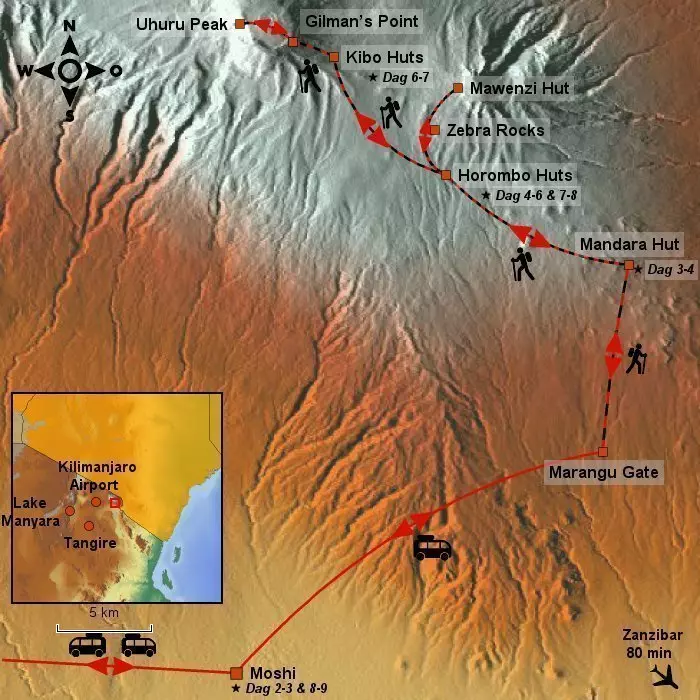 Høyder: Kibo Huts: 4 695 moh., Uhuru Peak: 5 895 moh., Horombo Huts: 3 690 moh.