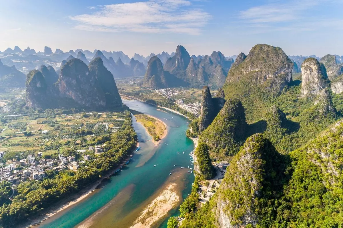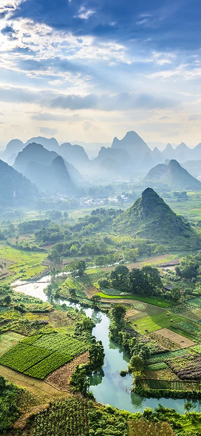 Yangshuo er omgitt av et nærmest poetisk landskap som tar pusten fra de fleste. Elven Li slynger seg mellom majestetiske kalksteinsfjell som reiser seg som vakre topper i terrenget. Rett utenfor byen kan du oppleve driftige, lokale bønder som steller og dyrker sine ris-, grønnsaks- og blomstermarker.