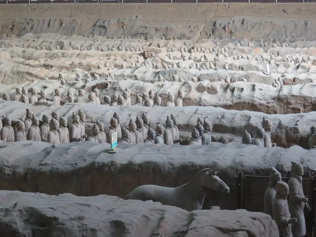 I 1974 fant bønder fragmenter av en skulptur i menneskestørrelse 45 km utenfor Xi’an. Arkeologer ble tilkalt og fortsatte med utgravingen, som resulterte i verdens største funn av underjordiske skulpturer. Over 7000 terrakottakrigere, hester og vogner ble oppdaget. Krigerne måler mellom 175 cm og 190 cm og har alle forskjellige ansiktstrekk, frisyrer og påkledning. De er oppstilt på rekke, klar til kamp, i nærheten av keiser Qin Shi Huangs gravsted. Det sies nemlig at krigerne ble laget for å beskytte herskeren sin i livet etter døden.