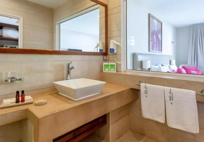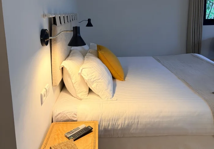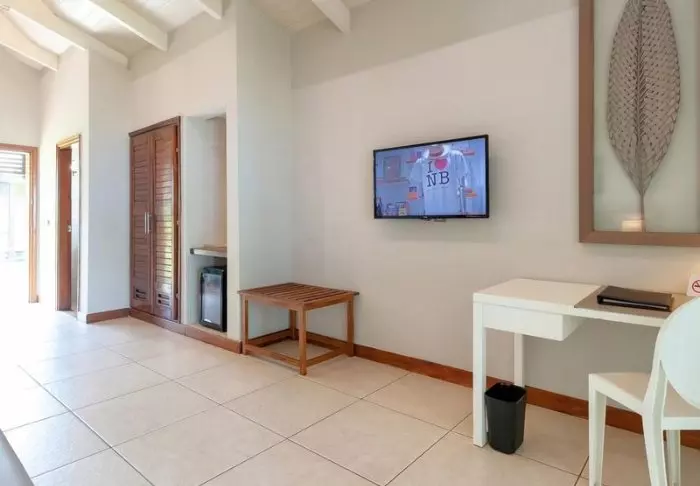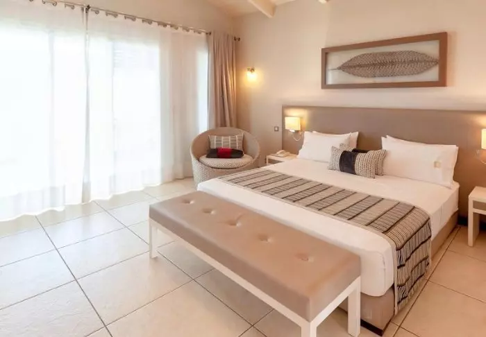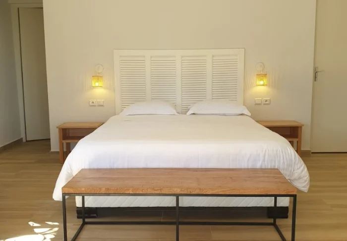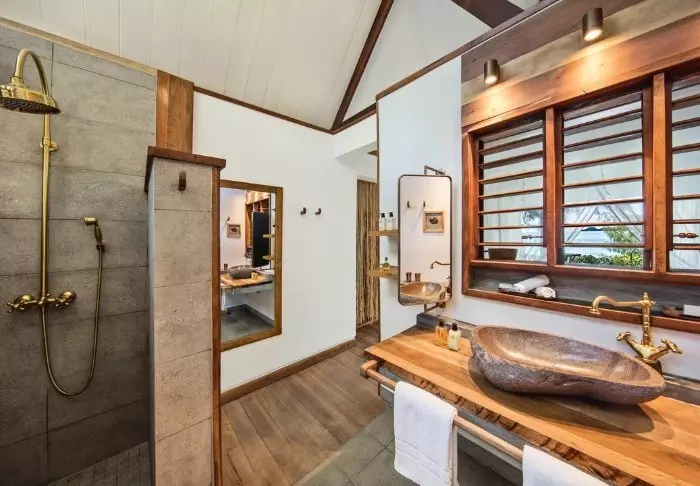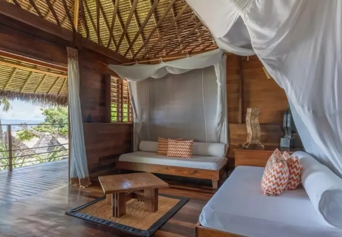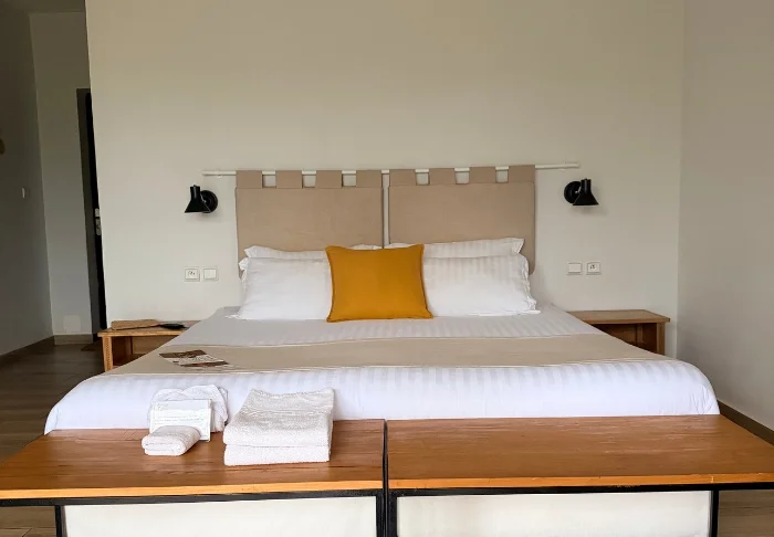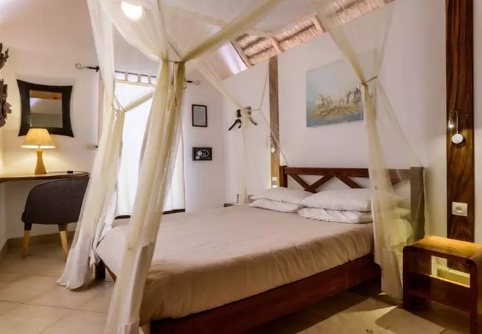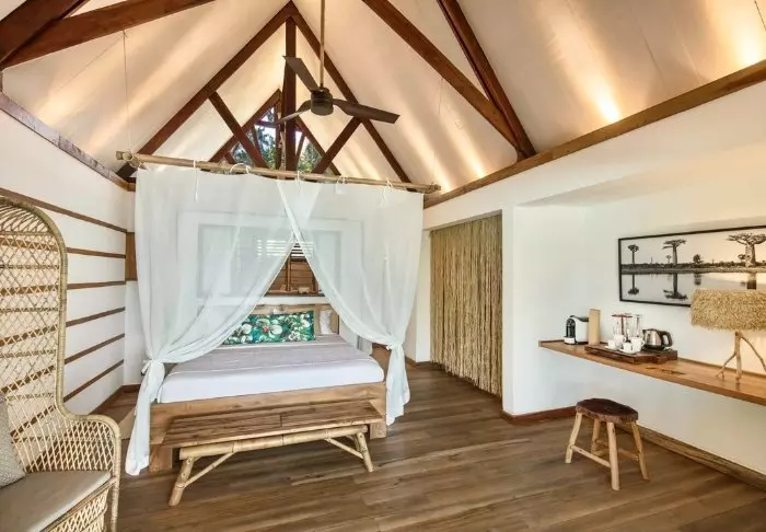 Innredningen er enkel og naturlig, med tregulv, store senger med myggnett, og vakre detaljer i sisal og tekstil. Her finner du aircondition, Wi-Fi, sikkerhetsboks og minibar, og badene er romslige og lyse, med både dusj og toalettartikler.