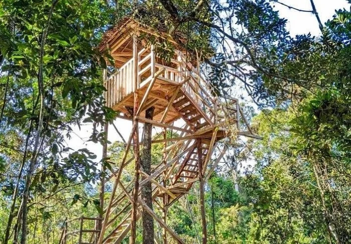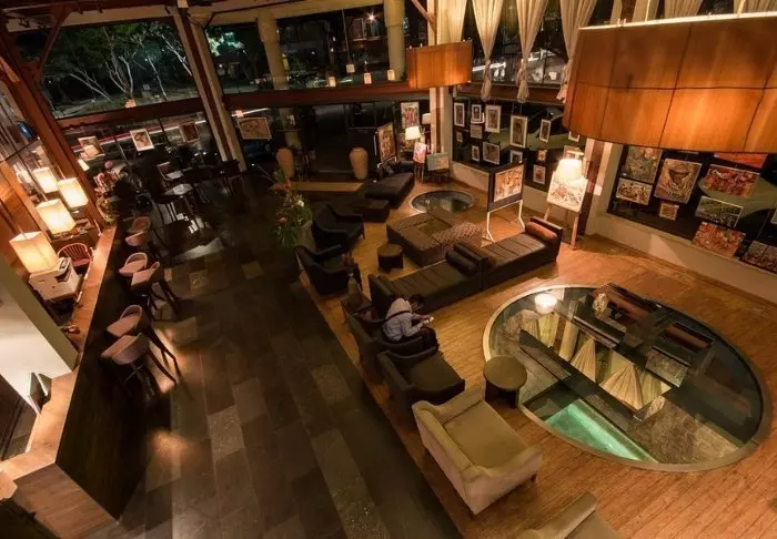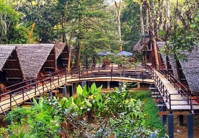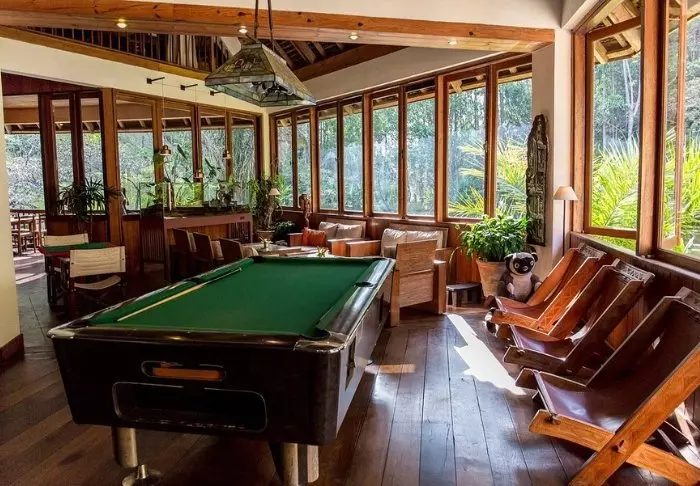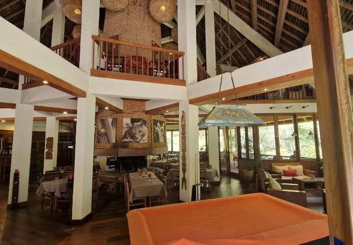 Lodgen, derimot, er definitivt verdt et besøk i seg selv. Her finnes det 28 bungalower, som er enkelt møblert med bare en seng med myggnett, takvifte, sikkerhetsboks og minibar. Det som gjør lodgen så spesiell, er beliggenheten midt i regnskogen, og spesielt restauranten, som har en veranda som er bygget over en liten innsjø.