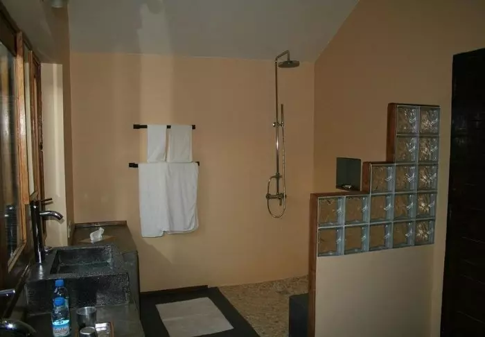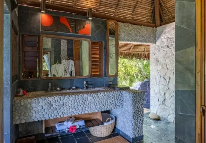 Alle bungalowene har naturligvis egne bad. Dusjen er utendørs, slik at du alltid er nær naturen.