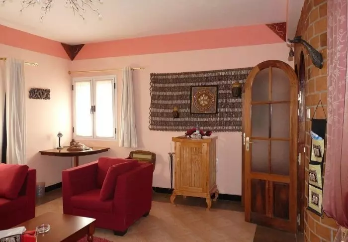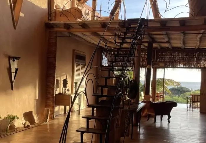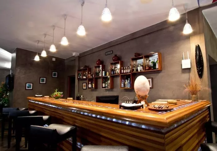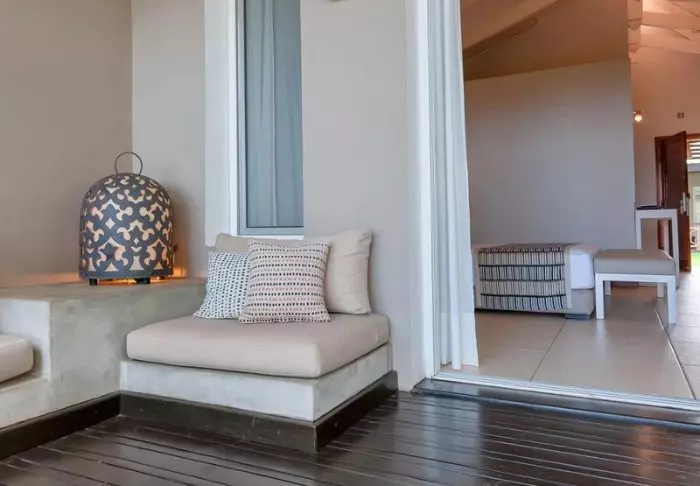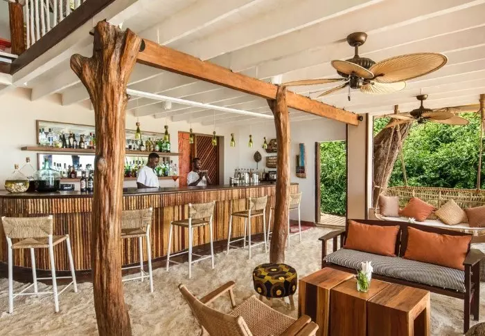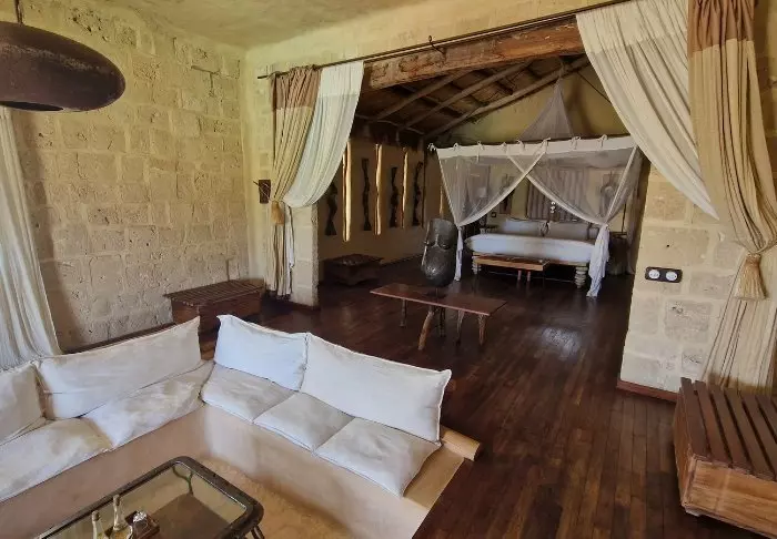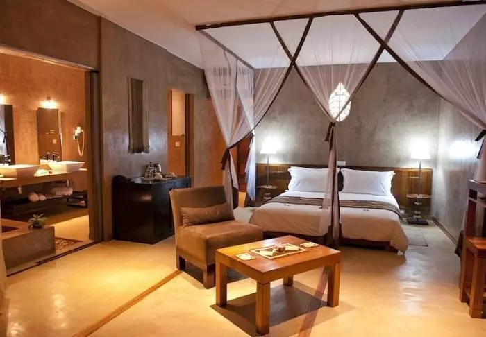 På innsiden kan du tydelig føle innflytelsen fra Afrika. Brune farger, tre og stein dominerer, men på en luksuriøs og smakfull måte. Alt er vakkert dekorert, og det føles nesten som om du besøker en privat kunstsamler.
