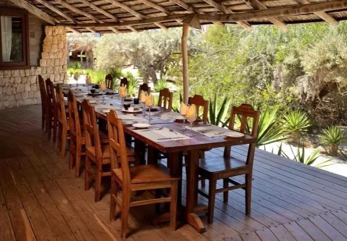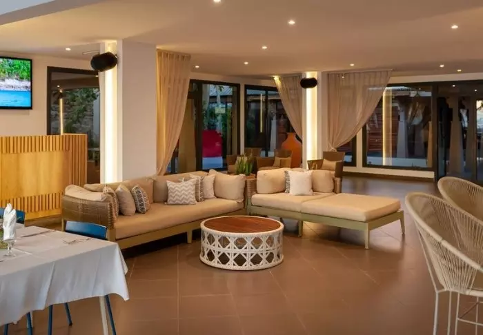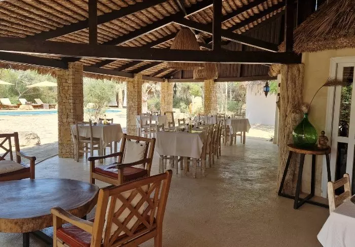 Restauranten serverer deilige retter med blant annet ferskfanget fisk og lokale råvarer, og frokosten kan nytes i skyggen på terrassen. Baren ligger rett ved bassenget og er det naturlige stedet å avslutte dagen mens solen synker i havet.
