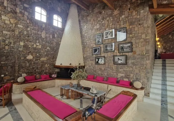 Bougainvilleane er et fargerikt innslag som også matcher putene og gardinene, samtidig som de står i kontrast til de rustikke steinveggene og det vakre gulvet.