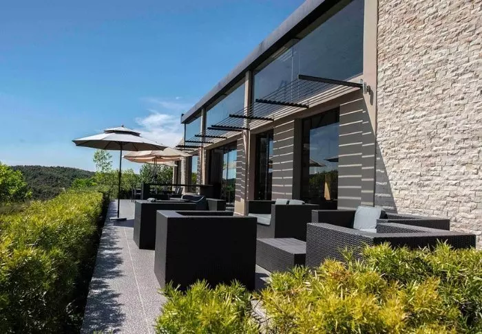 Fellesområdene inkluderer en vakker restaurant og bar, og en nydelig solterrasse med et evighetsbasseng med utsikt over en liten innsjø.