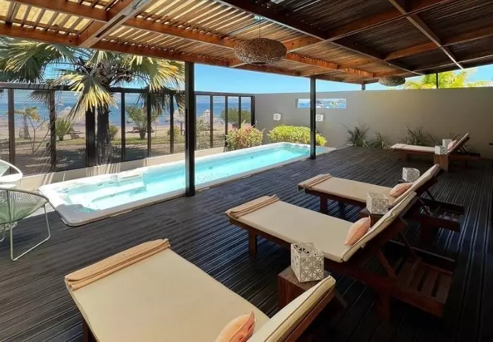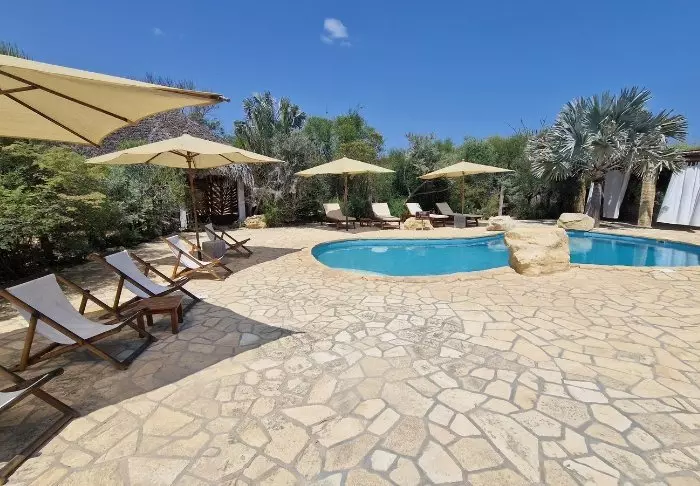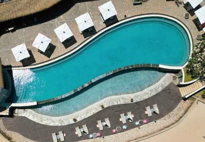 Bassenget har utsikt mot stranden, og her er det god plass til solsengene som innbyr til late dager med en god bok og et avkjølende bad. Stranden nedenfor er bred og fredelig – perfekt for en spasertur i den varme sanden.
