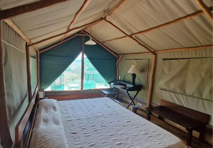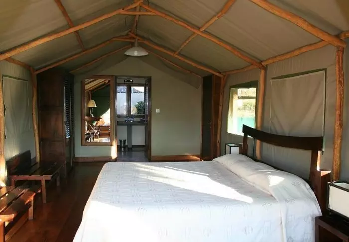 “Lodge” er neppe det helt rette begrepet, siden dette er en teltleir med 40 luksustelt i en fantastisk øst-afrikansk stil – med flotte tregulv, god plass, bad med både innendørs og utendørs dusj og en privat veranda med solsenger der du kan ta inn utsikten med full komfort. Teltleiren ligger på en høyde, med god plass mellom teltene, så du får en fantastisk følelse av god plass med vakker utsikt over det omkringliggende landskapet.