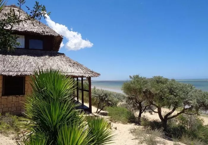 La Renalas 13 bungalower ligger i første rekke mot den meget brede stranden i Morondava.