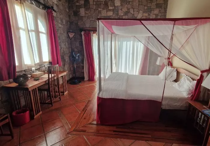 Hotellets 18 rom er relativt enkelt innredet med rustikke møbler og god plass til bagasjen. Alle rommene har selvsagt eget bad (om enn av noe eldre dato), vifte og myggnett over sengene.