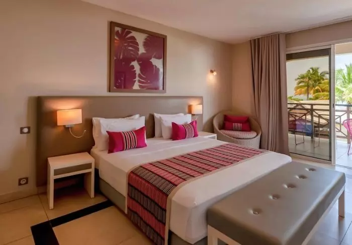 Selv om det egentlig er et flyplasshotell, har Nosy Manga en egen sjarm. De 33 rommene er alle unikt innredet med kunst på veggene og puter i livlige farger.