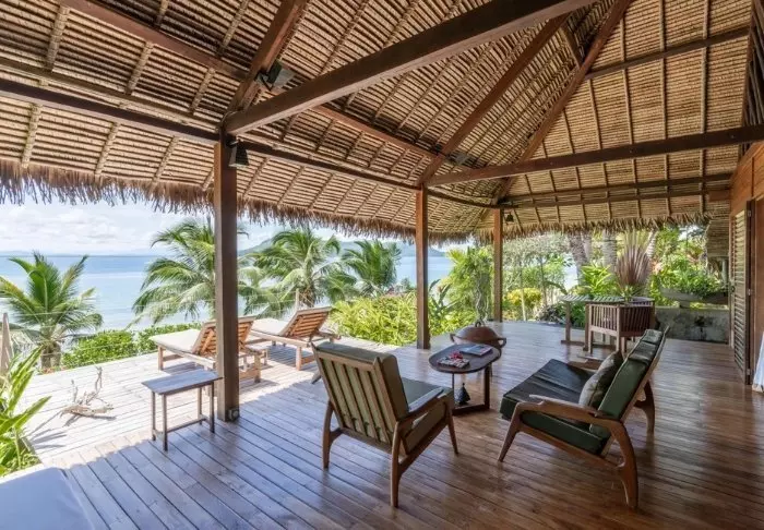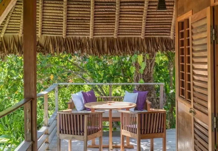 Bungalowene er bygget av stein med stråtak og bjelker av rosentre. Vakre, varme tregulv ønsker deg velkommen inn, og veggene er smakfullt dekorert med lokal kunst og håndverk. Akkurat passe – men ikke så mye at det forstyrrer utsikten fra de store vinduene. Takket være den flotte beliggenheten har alle bungalowene utsikt over stranden. Du kan også ta inn den flotte utsikten fra din private terrasse, der du finner et par solsenger som bare venter på å bli brukt.