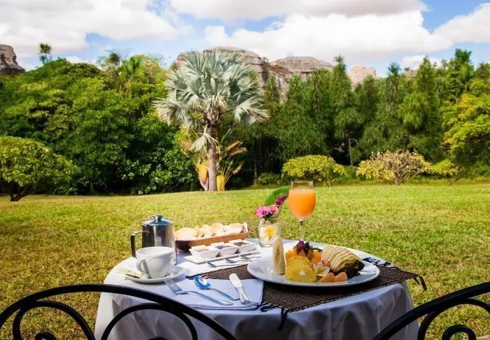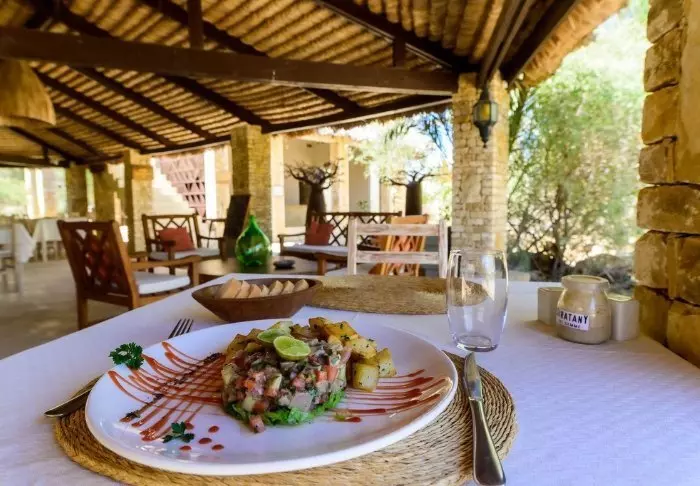 Hotellets restaurant byr på en spennende blanding av europeisk og madagaskisk kjøkken. Du kan spise ute på terrassen, der solen varmer på dagtid, eller nyte en drink under stjernehimmelen om kvelden. Frokosten er en opplevelse i seg selv – med fersk frukt, hjemmebakst, varme retter og nybrygget kaffe.