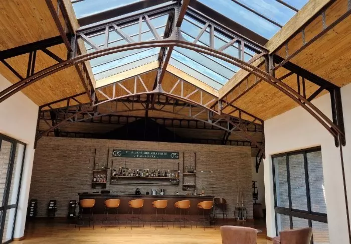 Lodgen er preget av sin supermoderne, rå og elegante industrielle design med høye tak, en stor åpen peis midt i restauranten og takkonstruksjoner i stål. Inspirasjonen er tydelig hentet fra grafittgruven og den tilhørende industrien du kan se på vei til lodgen.