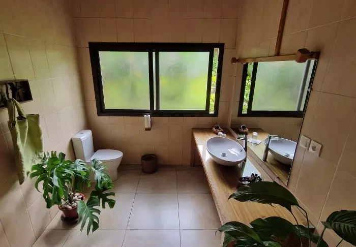 Rommene ligger i en åsside omgitt av regnskog, og interiøret er lyst og varmt – en blanding av nordisk enkelhet med et streif av Bali.