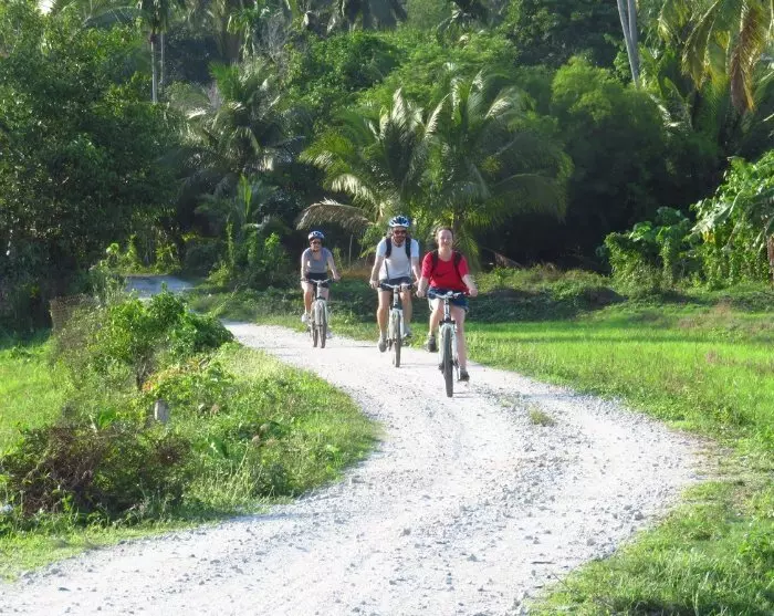 Du blir hentet på hotellet og kjørt til den lille fiskerlandsbyen Kuala Teriang på Langkawis vestkyst. Her får du utlevert sykkelhjelm, og sykkelen din justeres så den passer perfekt. Etter en kort introduksjon starter sykkelturen. Du sykler på små stier i vakre omgivelser, og underveis kan du nyte synet av den majestetiske Mat Cincang-fjellkjeden som reiser seg i bakgrunnen, samt frodige rismarker, fruktplantasjer, fargerike hager og små fiskehavner.