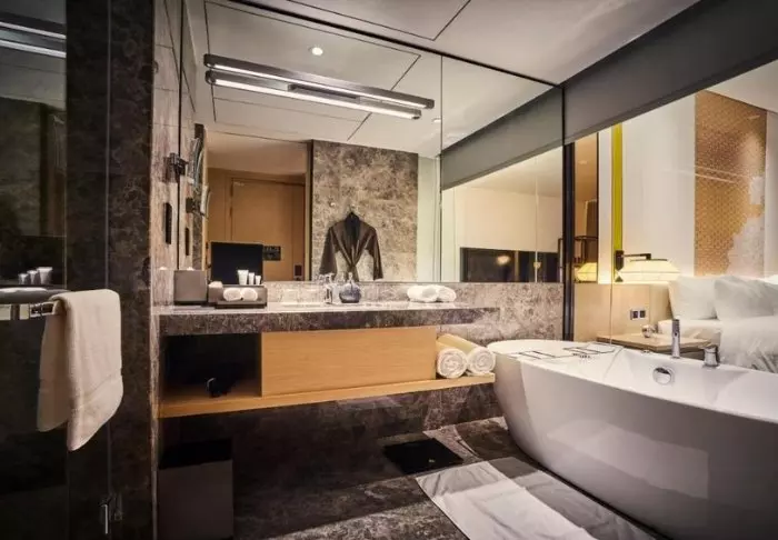 Hotellets store rom er stilfullt innredet med store vinduspartier, som slipper inn mye naturlig lys og gir en fantastisk utsikt over byens skyline. Samtidig holdes støy og varme ute, takket være hotellets unike byggemåte. Rommene er designet med øye for detaljer i diskrete jordnyanser og har moderne fasiliteter som aircondition, Wi-Fi, flatskjerm-TV, safe, minibar med snacks og drikkevarer samt et romslig bad med regndusj, badekar og toalettartikler.