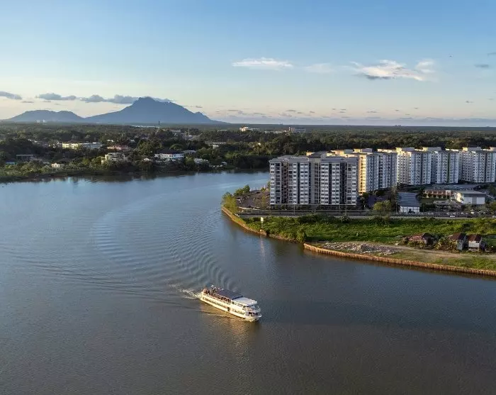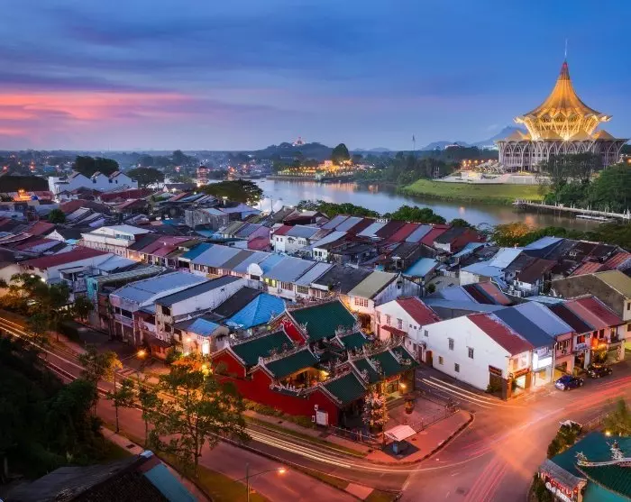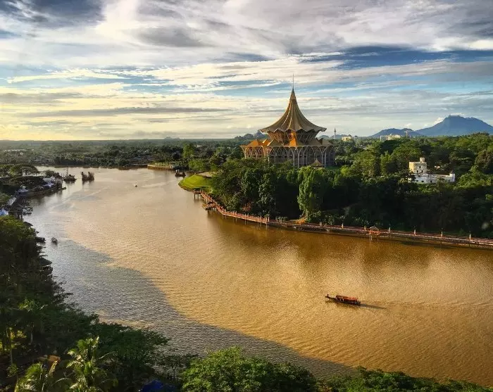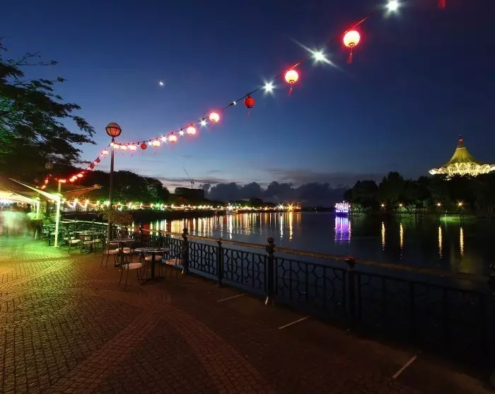 Kuching er vakkert beliggende ved Sarawak-elven og har en nesten kilometerlang promenade der du kan se på folkelivet og sjekke ut de mange butikkene og restaurantene. Om kvelden kan du sette deg til rette ved en av de mange spisestedene i den gamle bydelen, som frister med alt fra internasjonale favoritter til lokale spesialiteter, som den smakfulle laksa-suppen og nudelretten kolo mee. Etterpå kan du spasere langs promenaden og bli fascinert av Kuchings vann- og lysshow, som foregår hver kveld rundt kl. 20 foran Sarawaks regjeringsbygning.