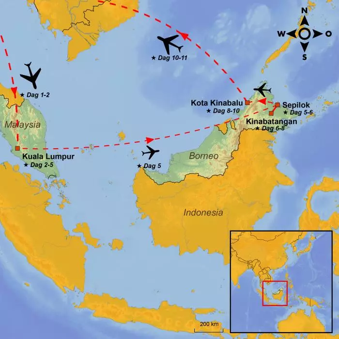 I dag fortsetter reisen. Du forlater alle Kuala Lumpurs severdigheter og flyr videre til verdens tredje største øy, Borneo. Øya er hovedsakelig indonesisk i sør. I nord ligger det lille landet Brunei mellom de to malaysiske statene Sabah og Sarawak, som har mange fantastiske natur- og dyreopplevelser.