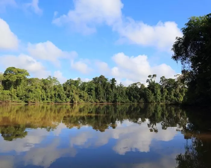 Når du går om bord i den lille båten, kan du lene deg tilbake og nyte regnskogens fredfulle atmosfære mens du seiler i soloppgangen. Landskapet rundt deg er som hentet ut av et eventyr med scenerier som kan ta pusten fra deg. Elvas slyngede løp går gjennom både åpen og tett regnskog, hvor brølende aper og syngende fugler skaper et unikt lydbilde.