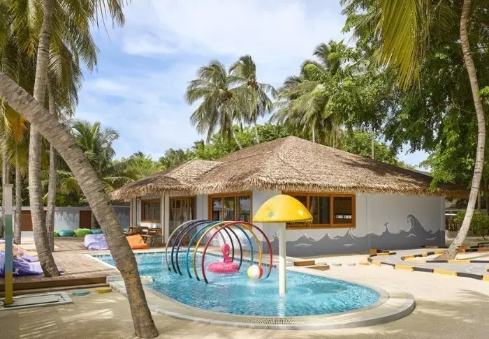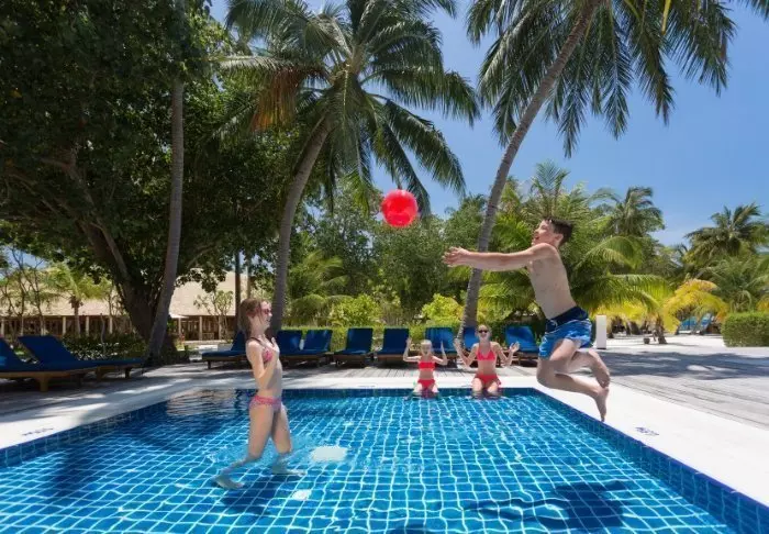 Meeru er delt inn i to soner – en spesielt for par, og en for familier – med barnebasseng og en familievennlig restaurant. Sandete stier med svaiende palmer og tropiske trær og busker forbinder forskjellige områder på øya, slik at du ikke trenger å gå hele veien rundt øya for å komme til favorittrestauranten din eller svømmebassenget. Hvis du synes avstandene er for store, kan du leie en sykkel eller få øyas buggy til å kjøre deg.
