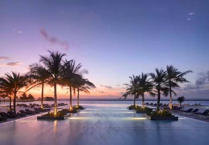 Resorten har et evighetsbasseng med utsikt over den turkise lagunen. Her kan du slappe av på en solseng eller en luftmadrass eller kanskje svømme et par lengder.