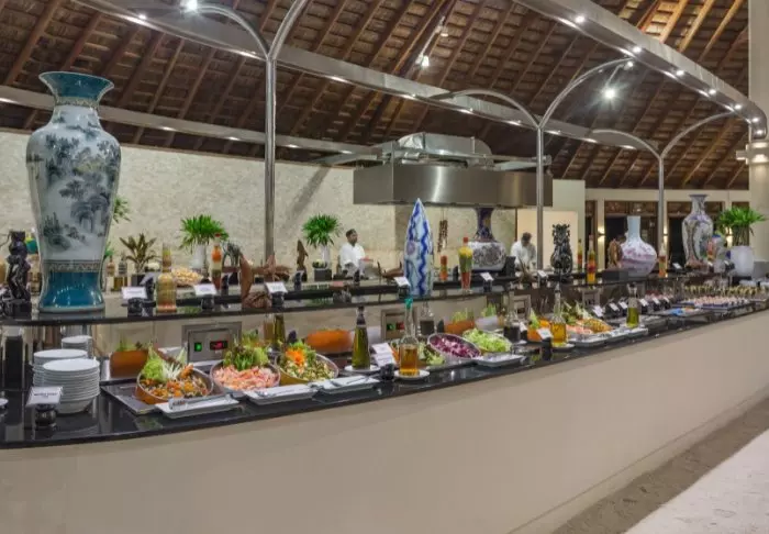 På øya finner du tre spisesteder: Hovedrestauranten, The Market, er inspirert av et utendørsmarked og tilbyr et stort utvalg retter fra hele verden. Hver dag er det forskjellige temaer som virkelig vil pirre smaksløkene dine. Du kan også spise på den italienske pizzarestauranten Il Basilico, som serverer forskellige italienske retter, og Chiringuito, som både er restaurant og bar og blant annet serverer grillmat. Rainbow er hovedbaren, som i tillegg til å friste med fargerike drinker også er et populært samlingssted med live musikk og underholdning hver kveld.