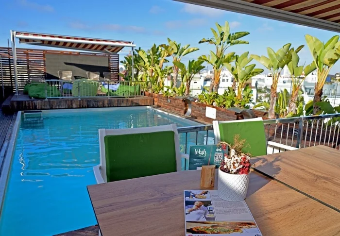 Fra hotellets sjarmerende takterrasse har du en flott utsikt over byen. Det er også her du finner hotellets basseng og den ene av hotellets to restauranter.