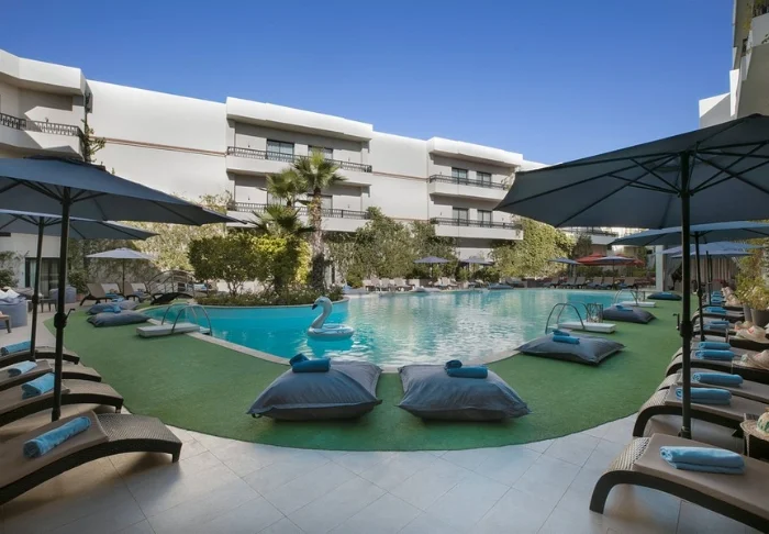 Bassenget er hotellets sentrale samlingspunkt, omgitt av både solsenger og sittegrupper.