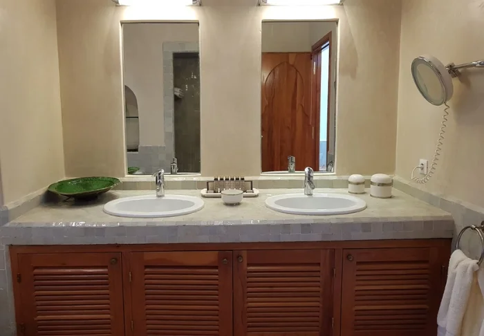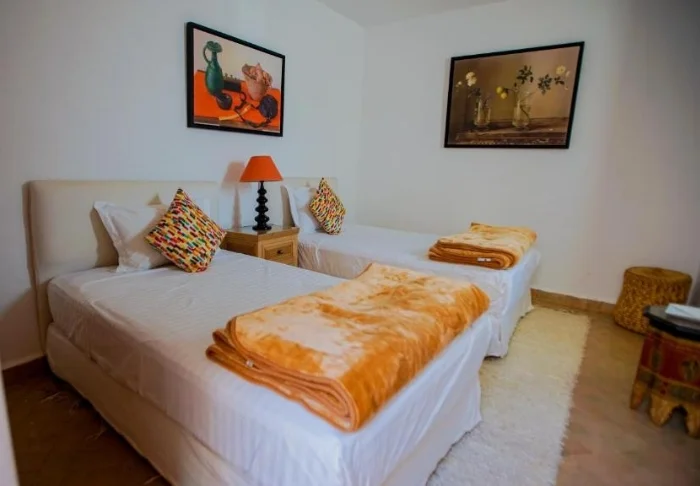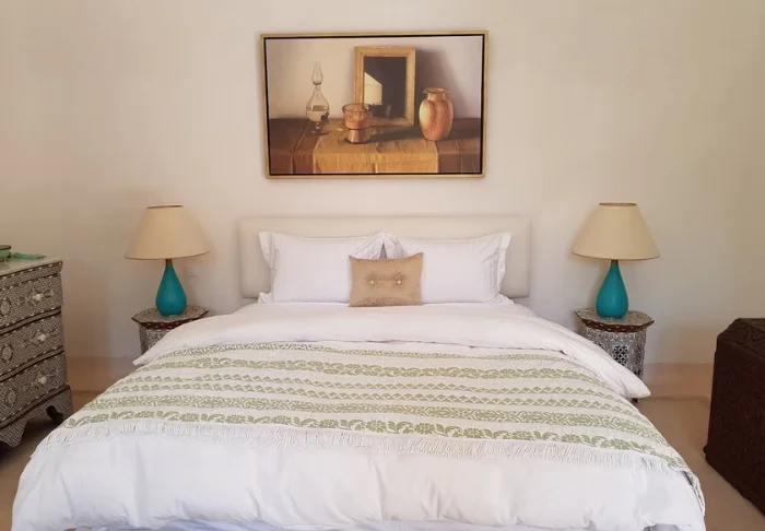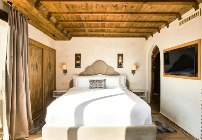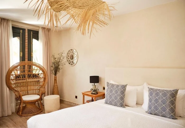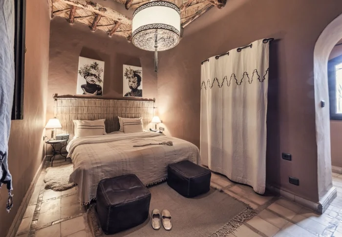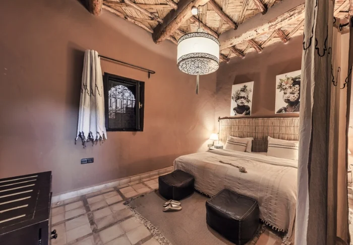 Her finnes det 10 rom, alle individuelt innredet med kunstverk, marokkanske håndverksdetaljer og moderne komfort – med blant annet aircondition og eget bad.