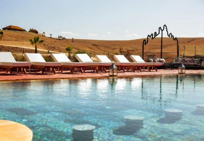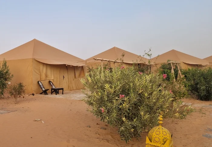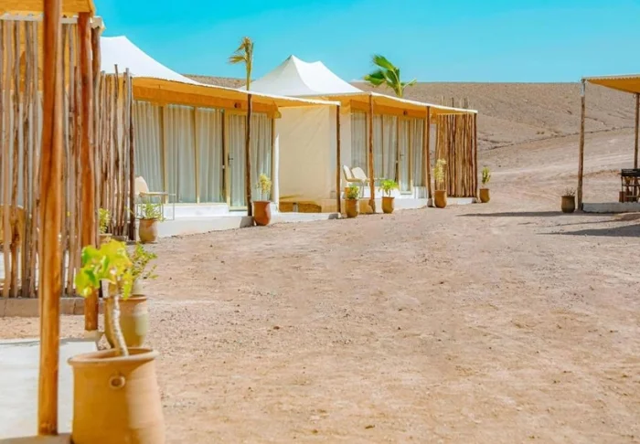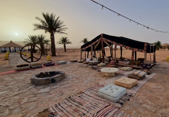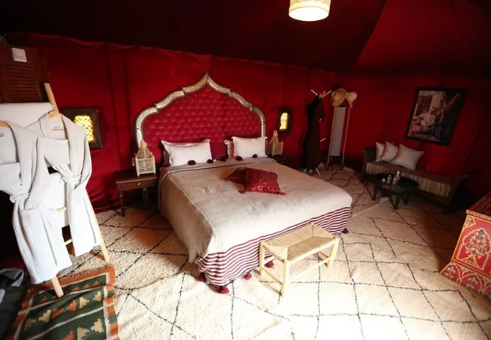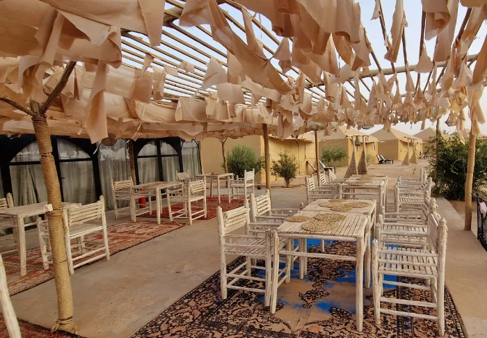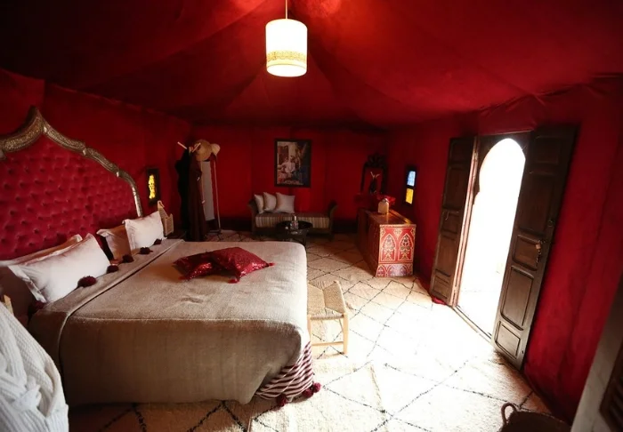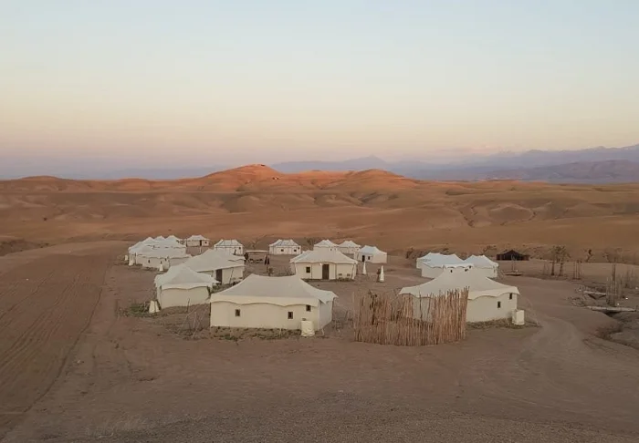 Bare én times kjøring fra Marrakech, men i en helt annen verden, finner du teltleiren Yes We Camp. Selv om leiren har 80 telt og er ganske stor, er den full av sjarm og hyggelig stemning. Teltene er spredt ut slik at det nesten føles som en liten landsby med små «torg» som naturlige samlingspunkter. Alle teltene har sin egen veranda med stoler.
