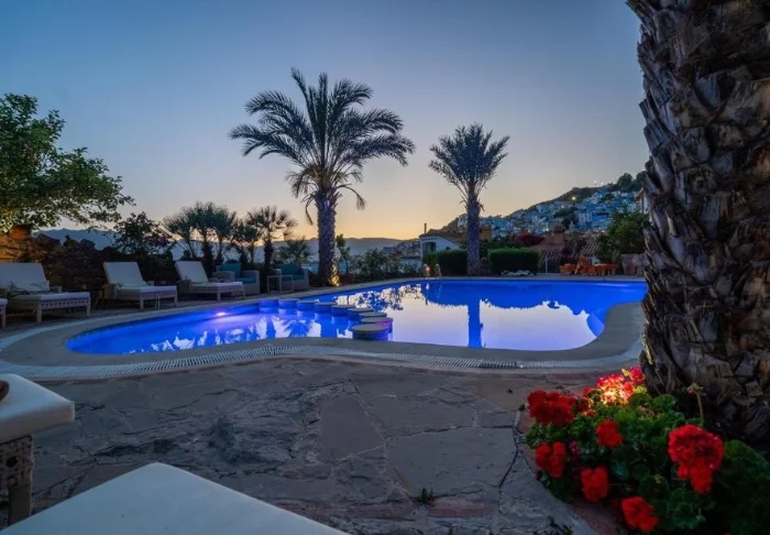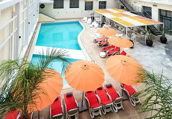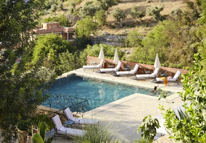 Bassenget frister til en forfriskende dukkert før middagen kan nytes på hotellets restaurant.