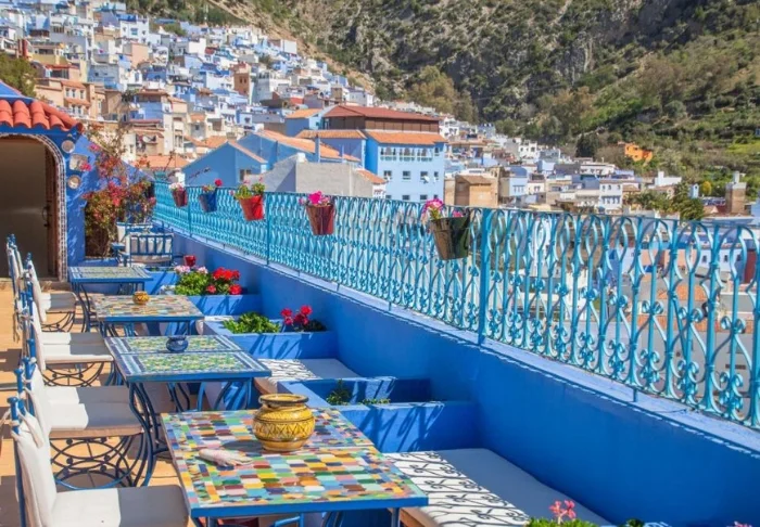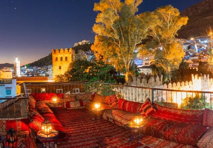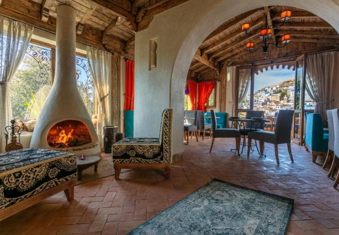 Hotellets restaurant serverer klassiske marokkanske retter – tagine, couscous og nybakt brød – som du kan nyte utendørs mens kvelden senker seg over Chefchaouen.